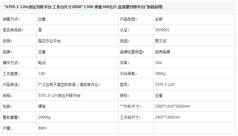 SJY0.3-12m剪叉式液壓升降平臺(tái)技術(shù)參數(shù):